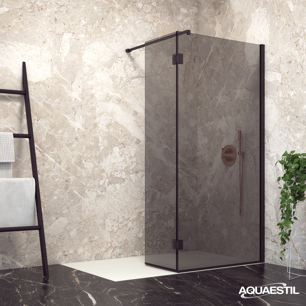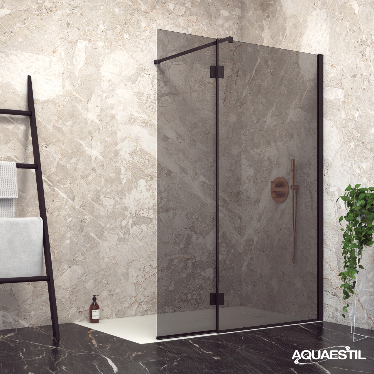 Eine Duschwand, der aus einer festen Glaswand und einem um 180° drehbaren Drehteil mit drei Stopppunkten.
