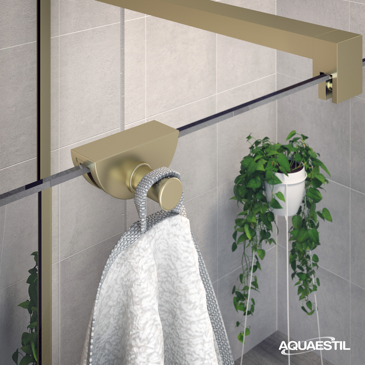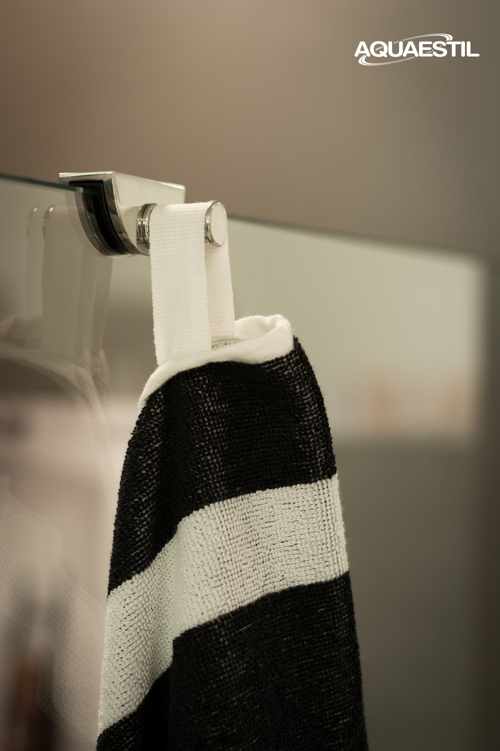 Der Aufhänger zur Montage auf Glas ist eine praktische und ästhetisch ansprechende Ergänzung für Duschwände ohne Profil auf der Oberseite. Der Aufhänger lässt sich in wenigen Sekunden auf einer bereits installierten Duschwand montieren und ist mit 6 oder 8 mm starkem Glas kompatibel. Dieses Produkt ist in Silber, Mattschwarz, Mattweiß oder Gold erhältlich und kann bei allen Aquaestil Händlern bestellt werden.