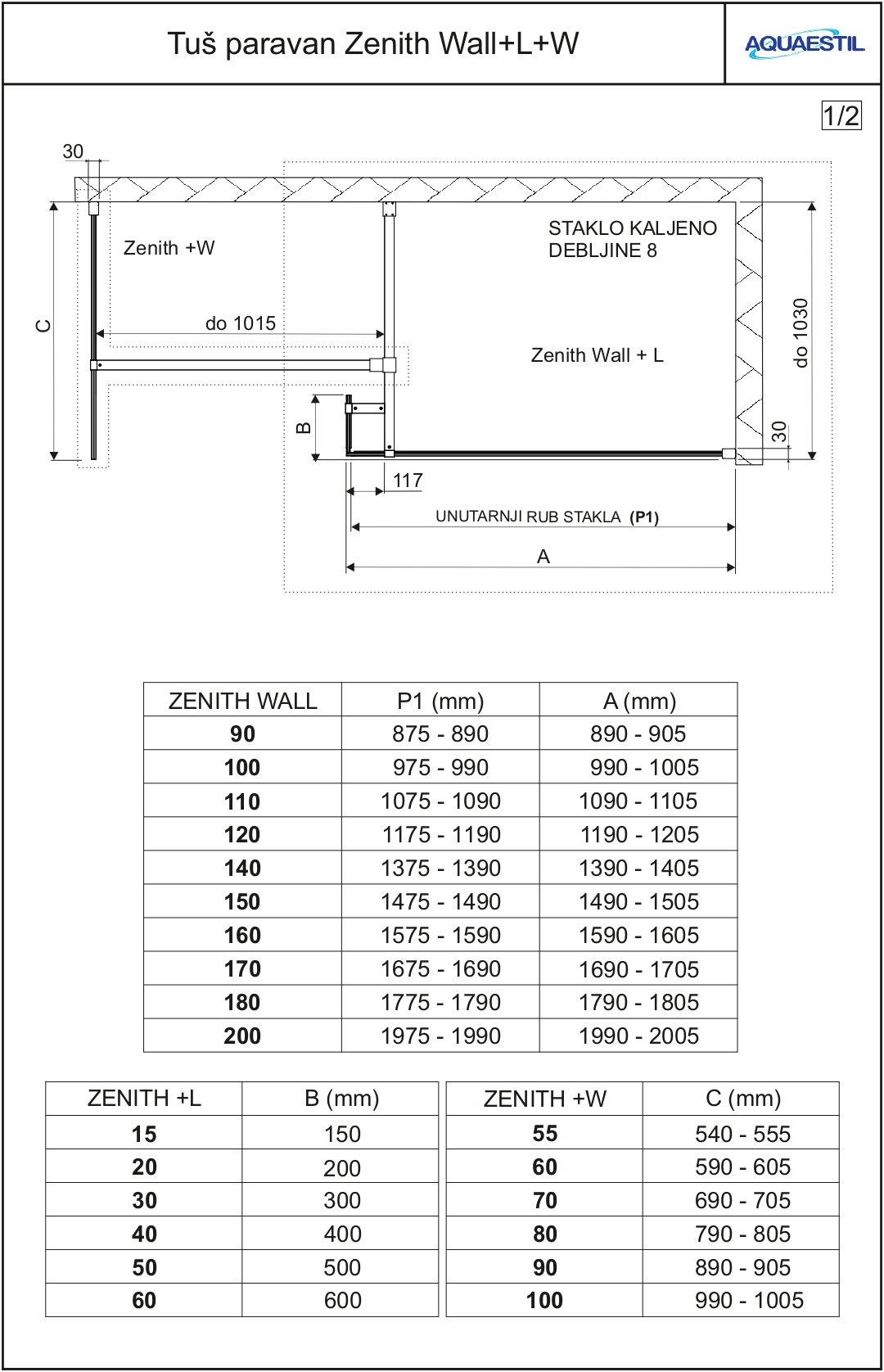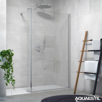 Zenith Wall with an additional fixed wall “+L” provides extra protection from water splashing. The shower screen is made of 8-mm-thick tempered glass treated with an anti-scale coating. On the bottom side, it is fixed with an elegant silver low profile, and on the top side, with wall fixators with a square section. The additional wall “+L” cannot stand alone and is ordered exclusively as an addition to the Zenith Wall shower screen.