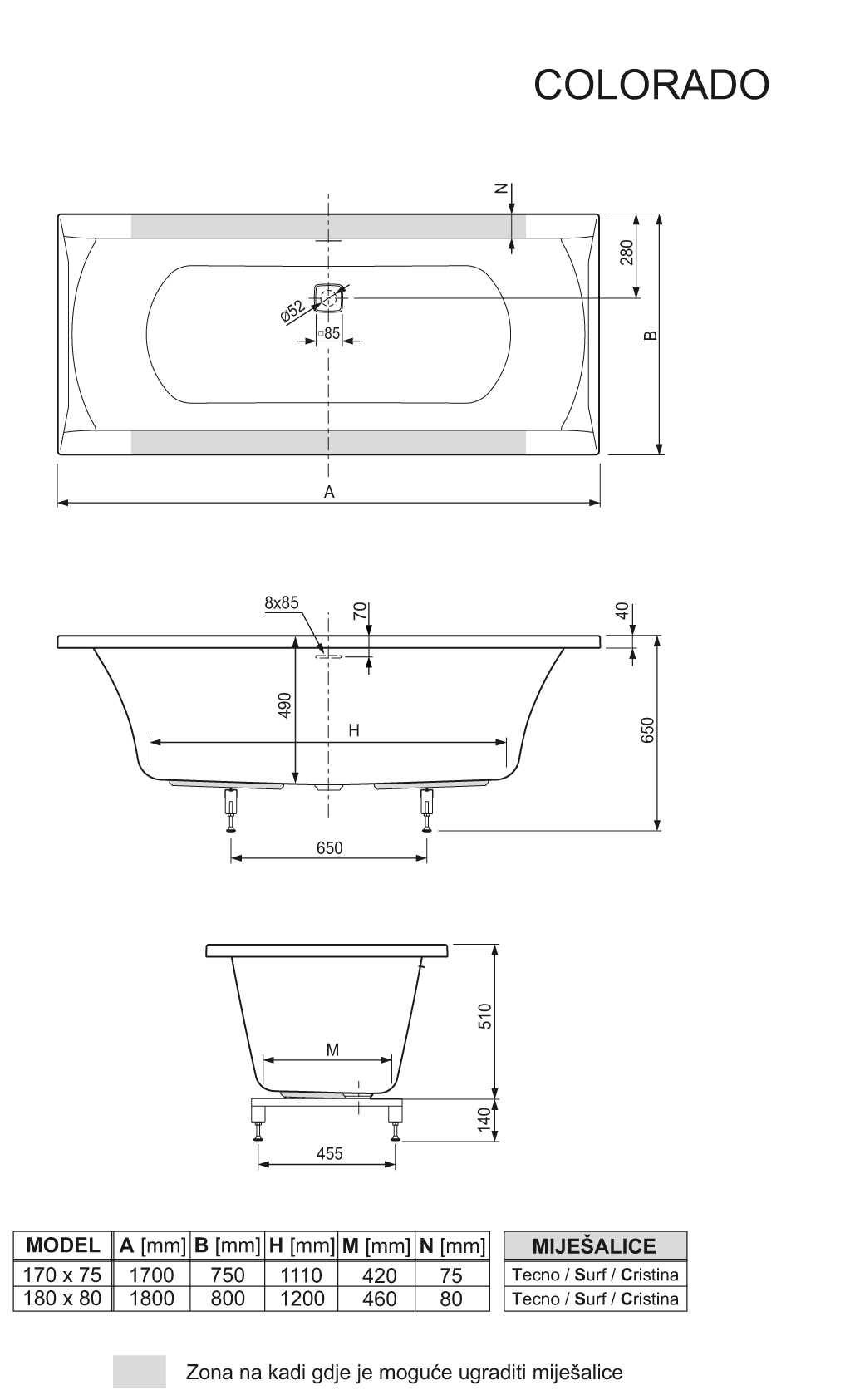 Colorado je elegantna i moderna pravokutna kada. U varijanti za obzidavanje isporučuje se s nogicama i ugrađenom preljevno-otočnom garniturom sa slot sifonom i kvadratnim klik-klak ventilom sifona.