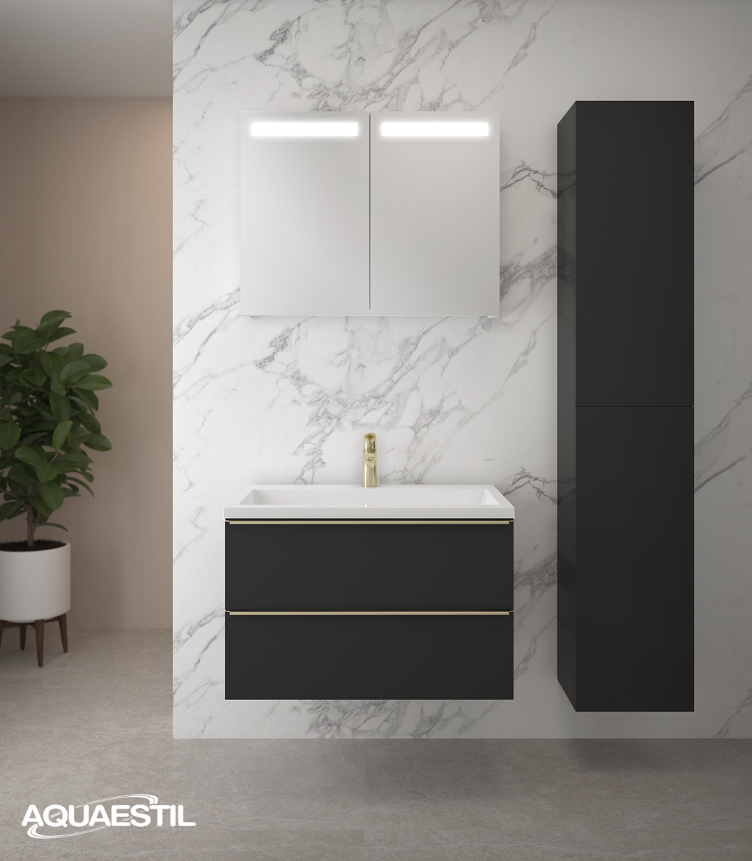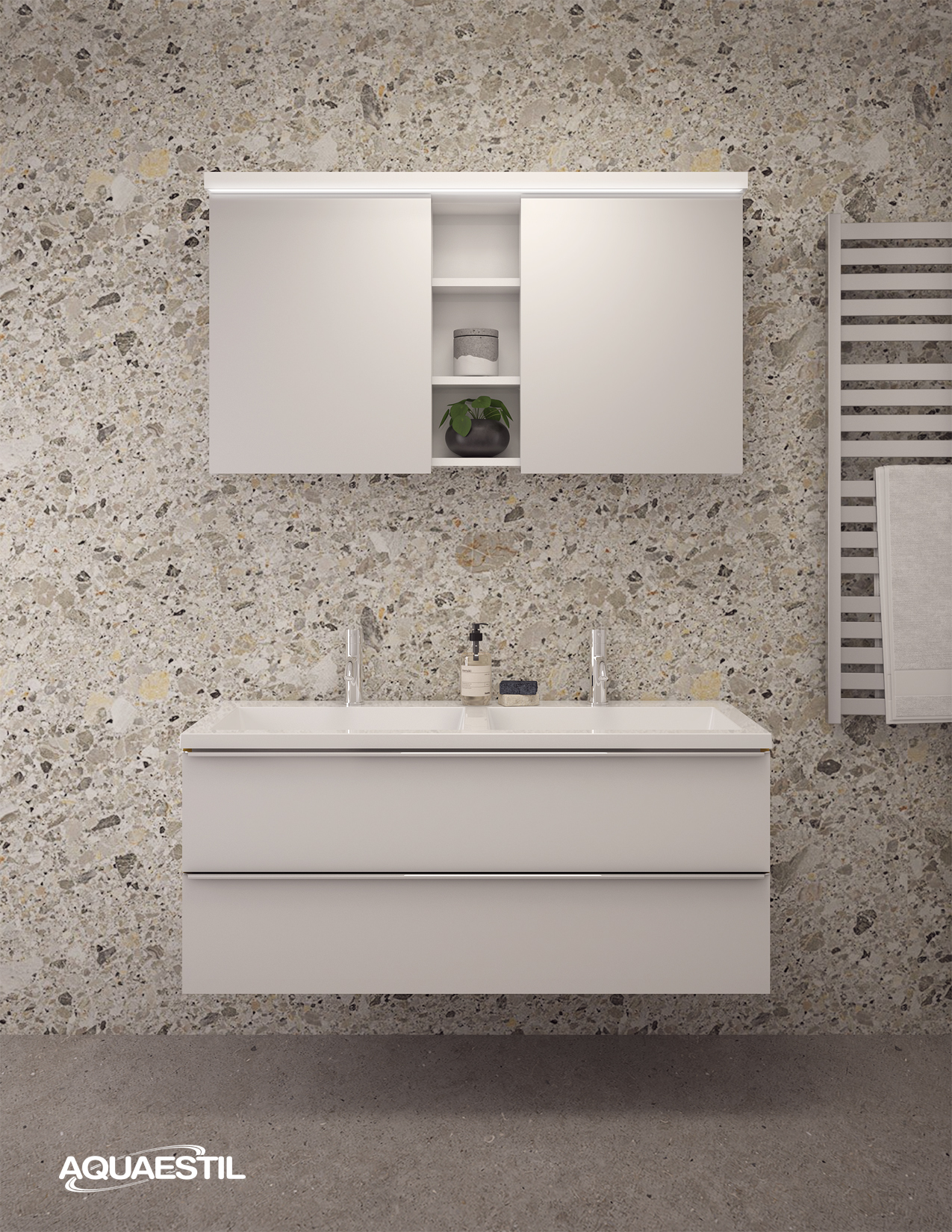 - Boje prezentirane na web stranici mogu u manjoj mjeri odstupati u odnosu na stvarne boje kupaonskog namještaja. Uzorci boja namještaja mogu se vidjeti uživo kod ovlaštenih Aquaestil maloprodajnih partnera ili u našem izložbenom salonu.
