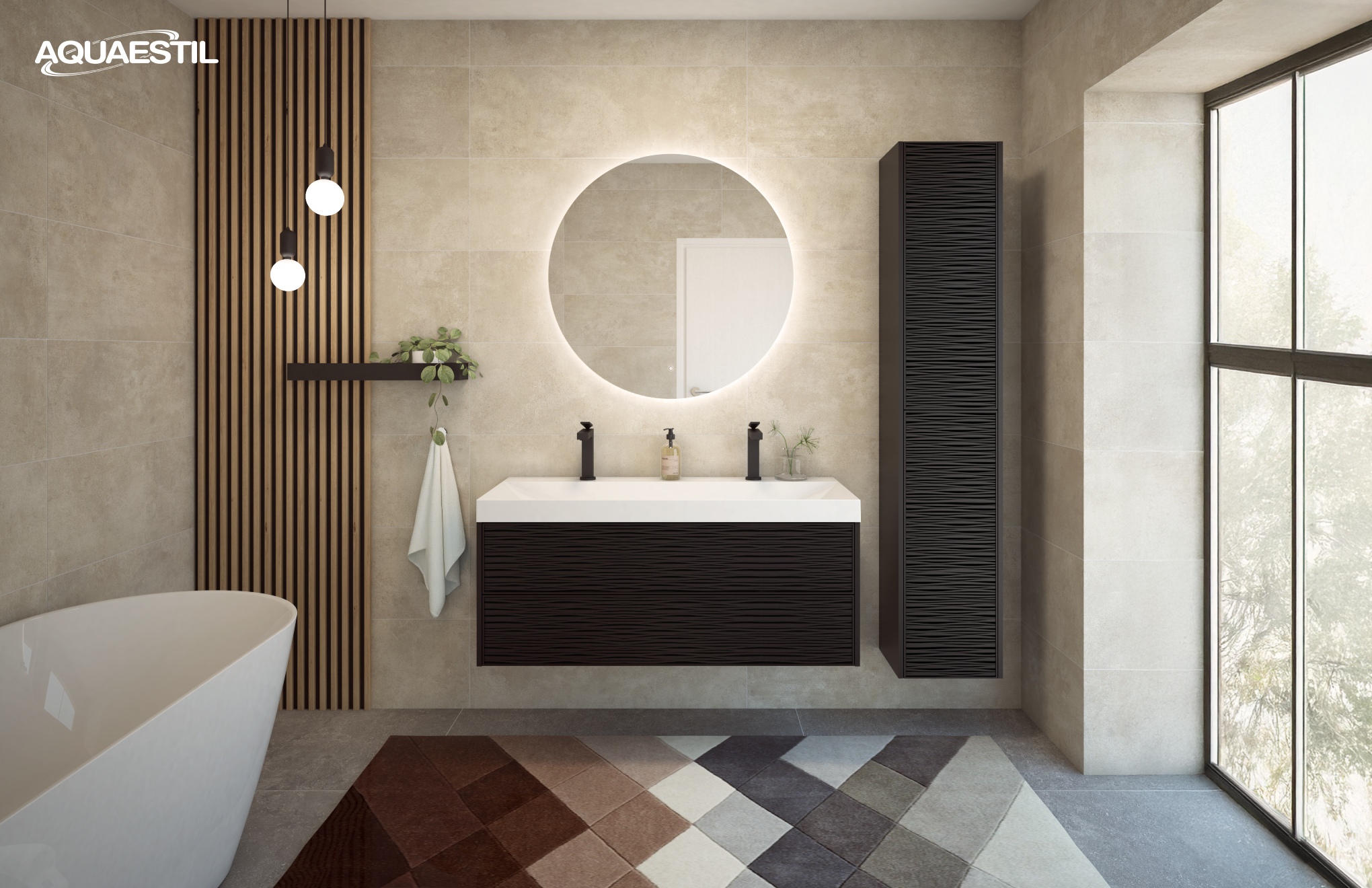Linija Myra donosi sofisticiran dizajn s prepoznatljivim 3D reljefnim frontama u prugastom ili rebrastom uzorku. Veliki, minimalistički oblikovan umivaonik tankih rubova, opremljen poklopcem odvoda u efektu površine, dodatno naglašava suvremenu eleganciju elemenata ove linije.