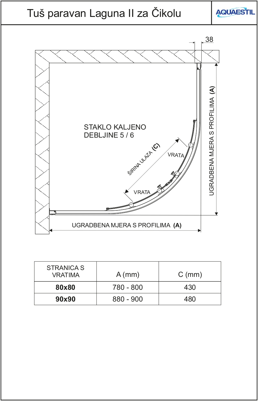 Kod tuš paravana koji nude mogućnost izrade po mjeri, u rubrici „Općenito“ nalazi se oznaka IZRADA PO MJERI. Pritiskom na oznaku, otvara se tablica s minimalnim i maksimalnim mogućim dimenzijama tuš paravana.