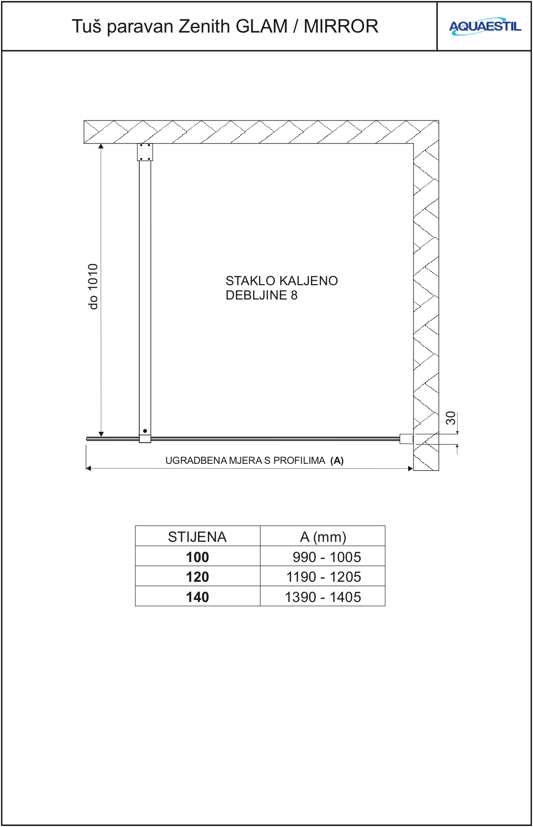 Zenith Mirror je elegantna fiksna stijena izrađena od 8 mm kaljenog stakla koja daje efekt ogledala s one strane na kojoj je upaljeno svijetlo. Kada se gleda sa suprotne strane paravana, staklo je poluprozirno. Na taj se način vizualno povećava prostor i dodaje nova funkcija paravanu. Brtvljenje na spoju tuš kade/pločica i fiksne stijene osigurava se aluminijskim U profilom. Ova stijena je dostupna u tri standardne dimenzije.