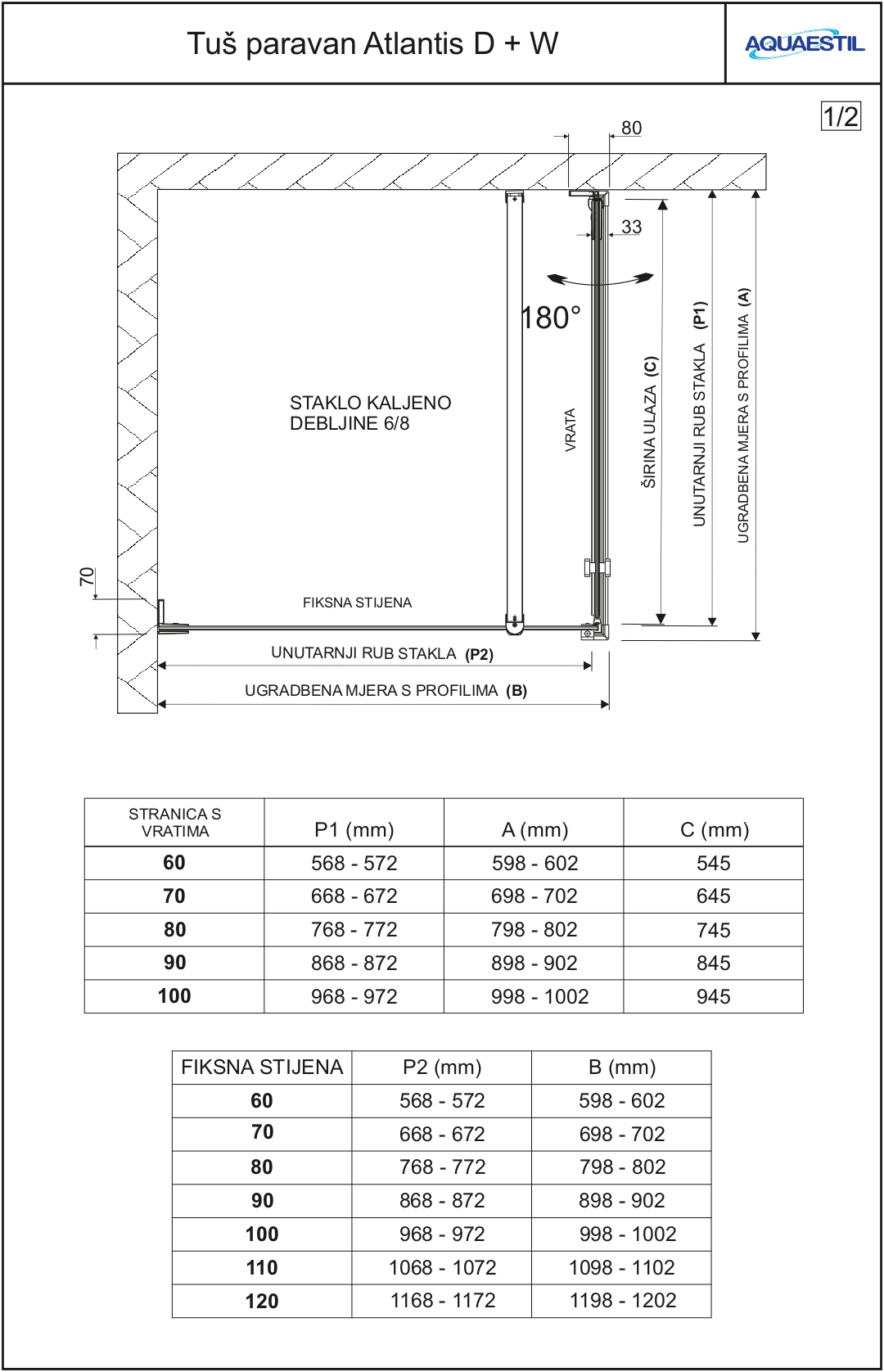 Atlantis D+W je luksuzni paravan koji se sastoji od vrata i jedne fiksne stranice. Stakla su pričvršćena elegantnim pantima, a vrata se mogu otvarati prema unutra i prema van zahvaljujući mimohodnoj brtvi. Lift sistem vrata omogućuje glatko otvaranje. Zbog vrlo male ugradbene tolerancije, ovaj model paravana naručuje se po mjeri uz priloženi nacrt.