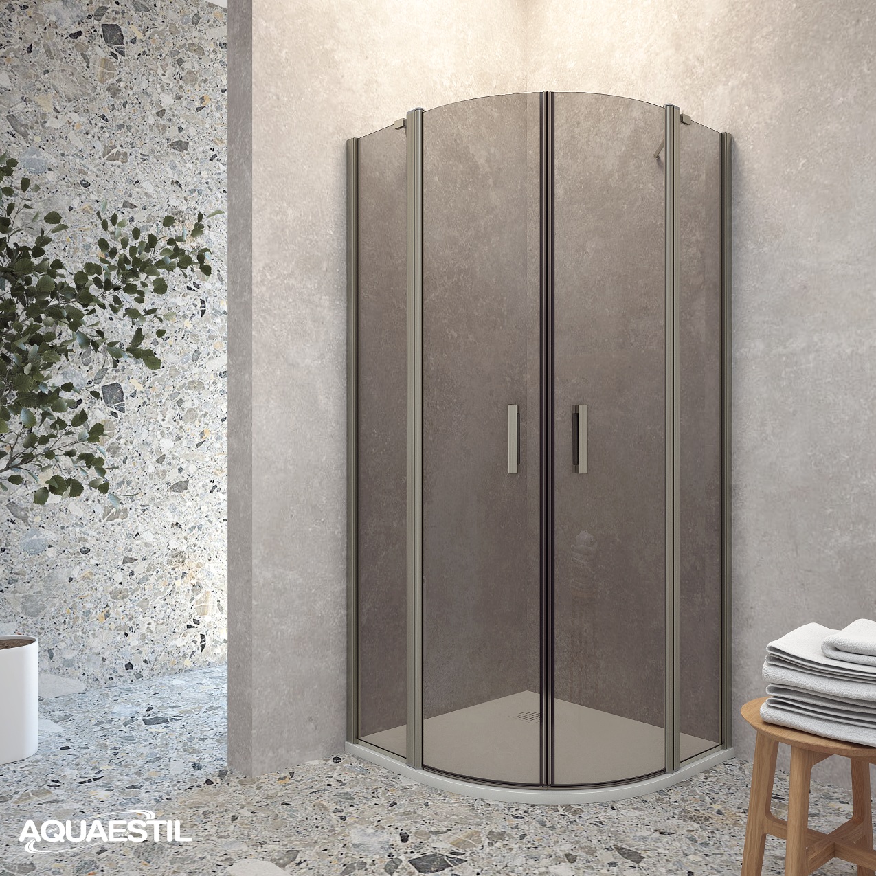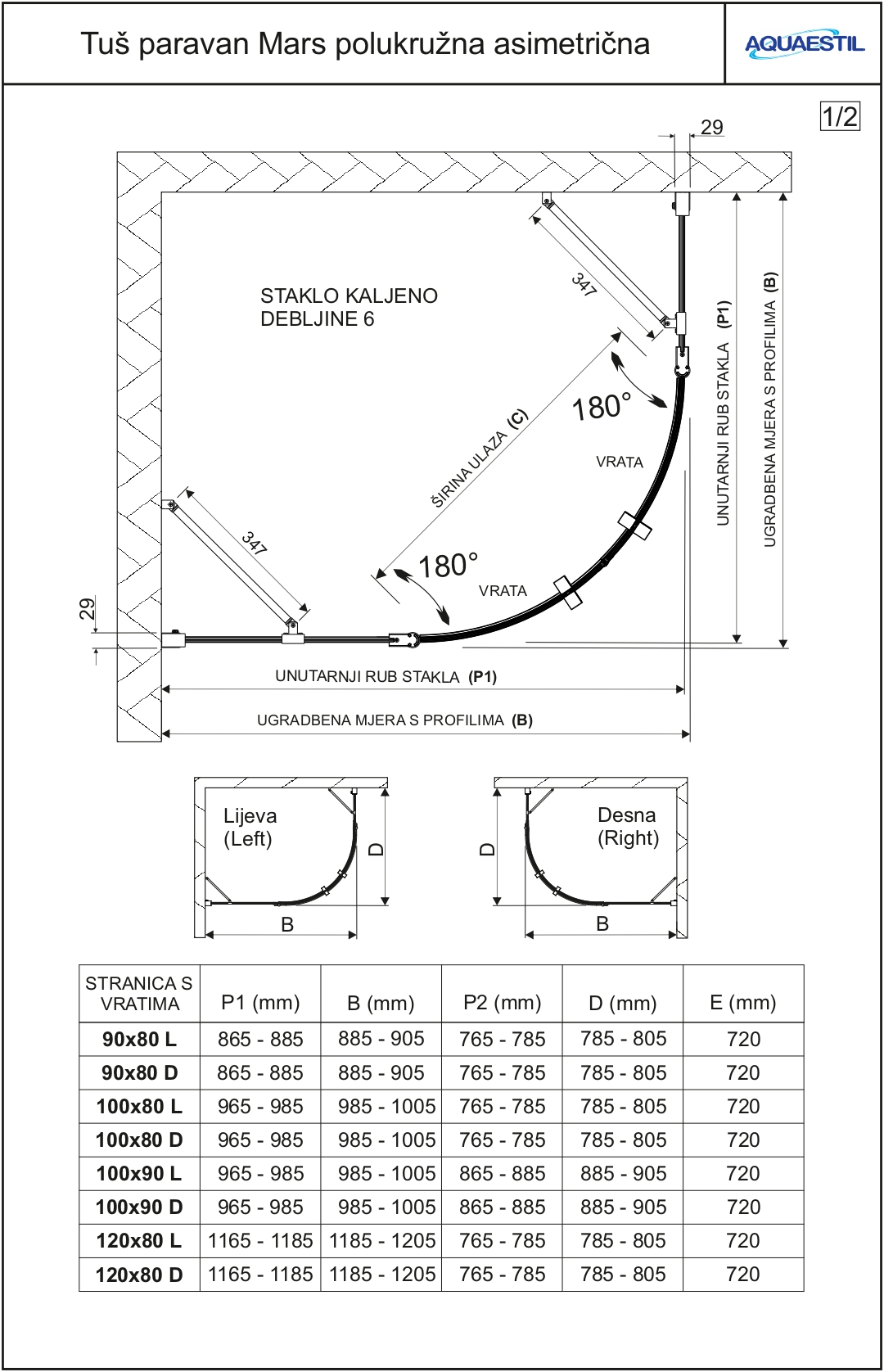 Moderni polukružni paravan koji se sastoji od dvije stranice s vratima „D“. Svaka stranica sastoji se od okretnih vrata i fiksnog dijela. Paravan je opremljen elegantnim profilima u srebrnoj, crnoj mat ili bijeloj mat boji i 6 mm kaljenim staklom, tvornički tretiranim nano-premazom protiv kamenca. Magnetne brtve i lift-sistem vrata osiguravaju visoku razinu funkcionalnosti i zaštitu od prskanja.