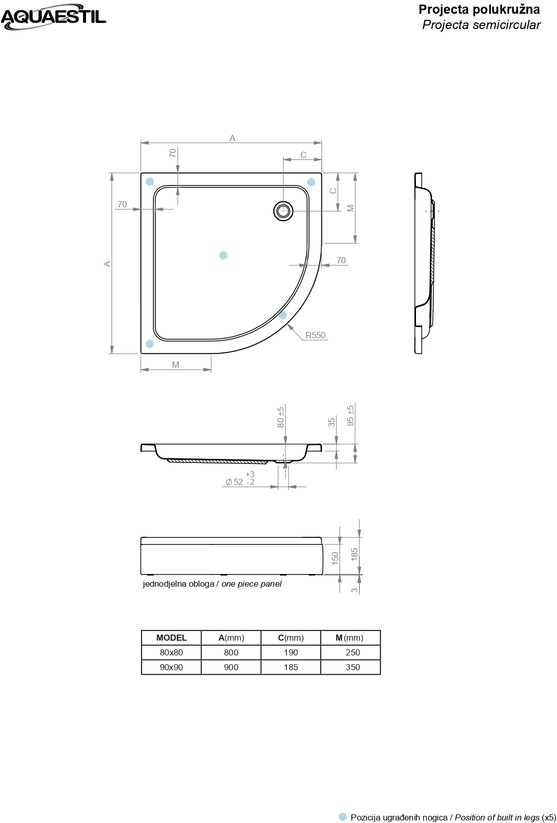 Projecta polukružna je klasična tuš kada dostupna u dvije standardne dimenzije, a isporučuje se samo u varijanti s tvornički ugrađenom oblogom i priloženim sifonom.