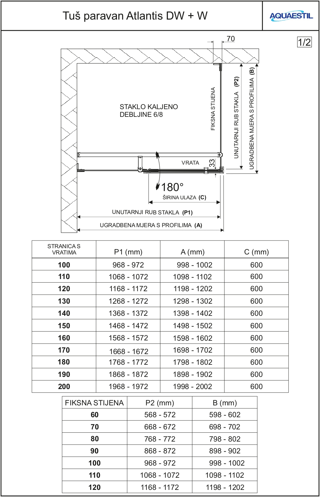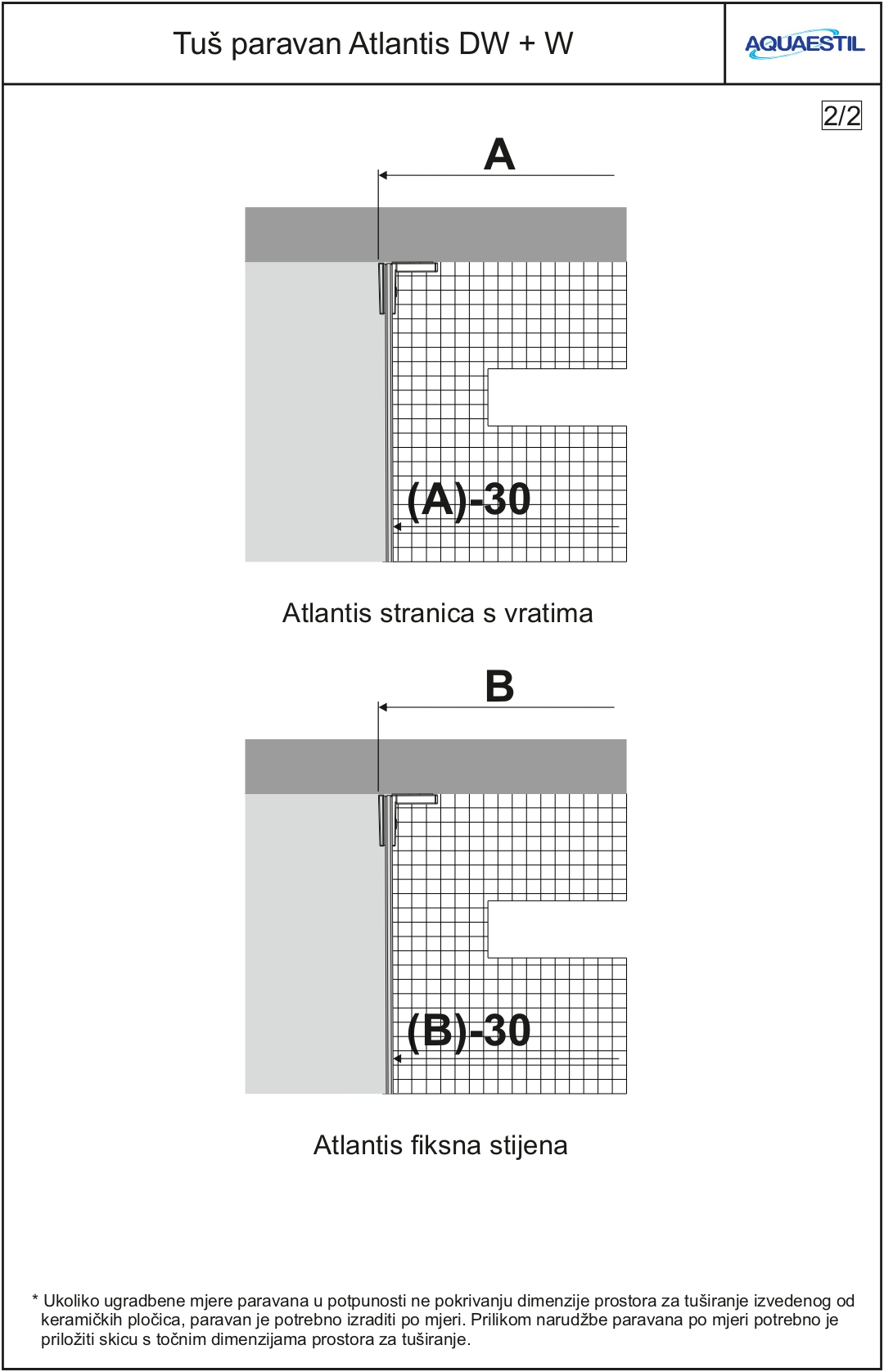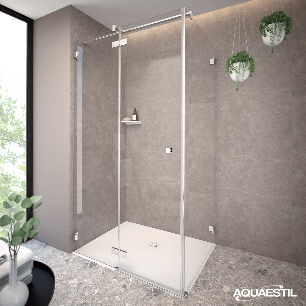 Atlantis PF+F è una parete di lusso costituita da un’anta fissa nella cui estensione sono incernierati una porta e un lato fisso. I vetri sono fissati con eleganti cerniere e la porta può essere aperta verso l'interno e verso l'esterno grazie alla guarnizione bypass. Il sistema di sollevamento della porta consente una facile apertura. A causa della tolleranza di installazione molto bassa, questo modello di parete viene ordinato su misura con disegno in allegato.