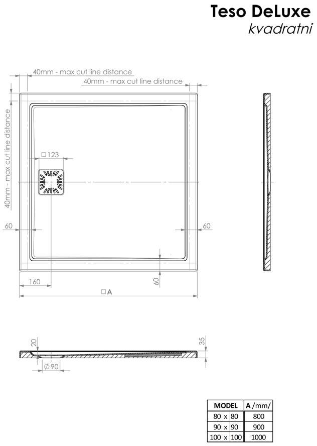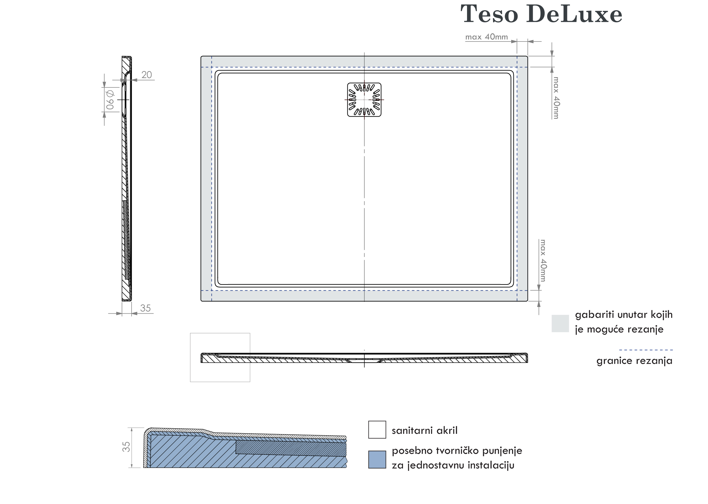 - Il piatto doccia Teso DeLuxe può essere tagliato entro determinate dimensioni. Quando si ordina il taglio di fabbrica, è necessario allegare uno schizzo con linee di taglio contrassegnate.