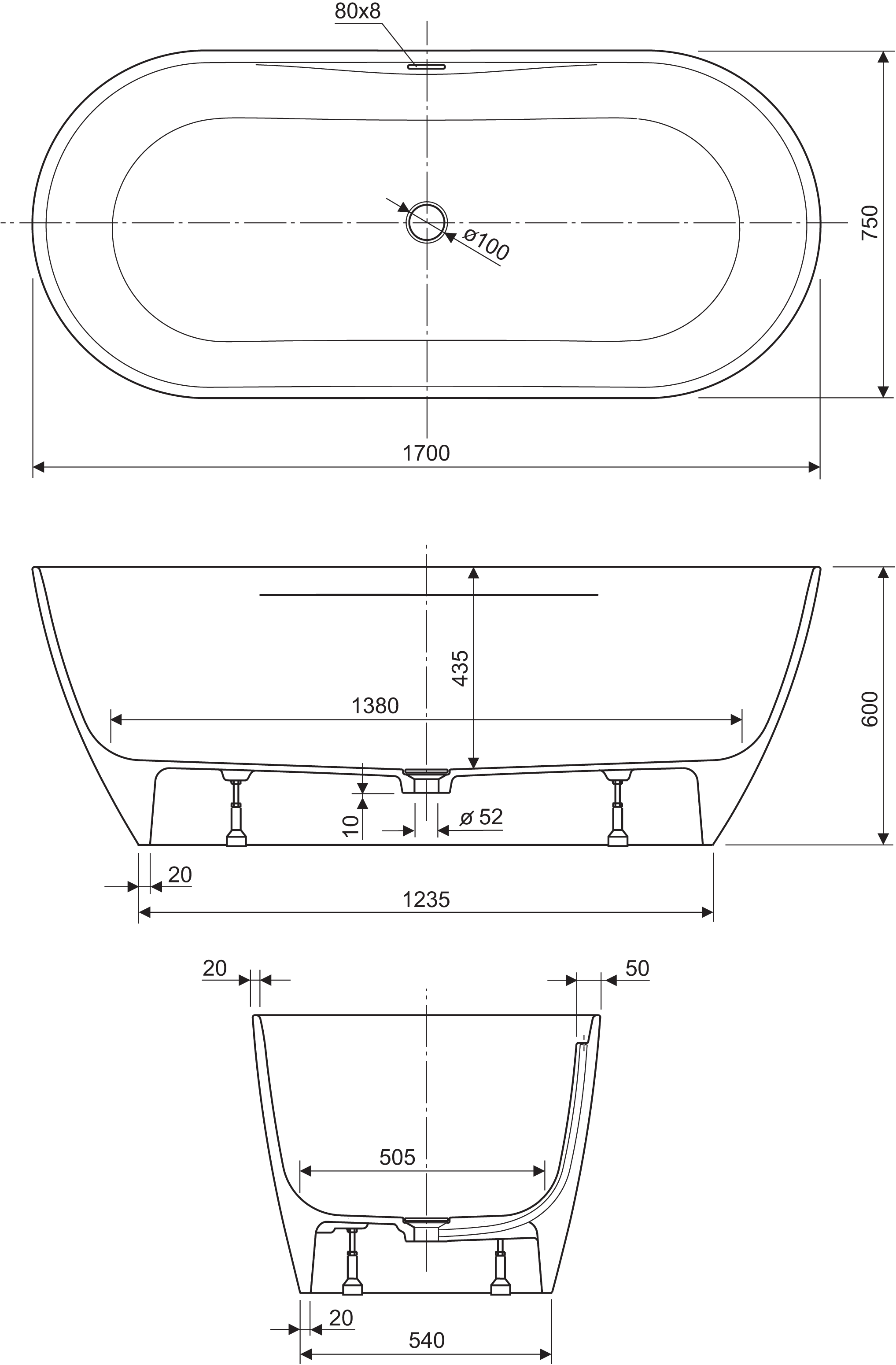 - Kadar se dobavlja z montiranimi nogicami in prelivno-odlivno garnituro z »režastim« prelivom in »klik-klak« ventilom sifona.