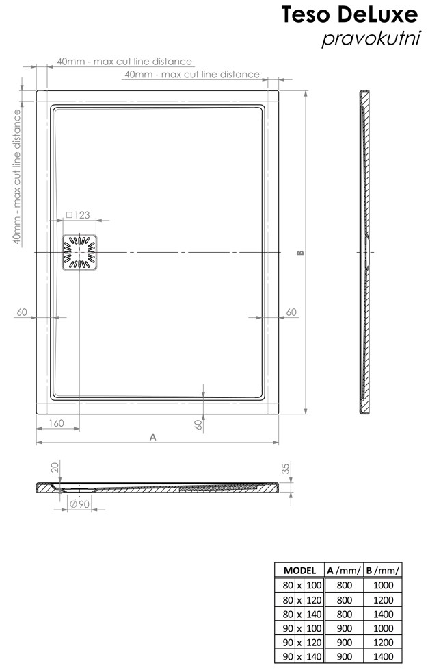 - Tuš kad Teso DeLuxe je možno krojiti znotraj določenih dimenzij. Ob naročilu tovarniškega razreza je potrebno priložiti skico z označenimi linijami reza.